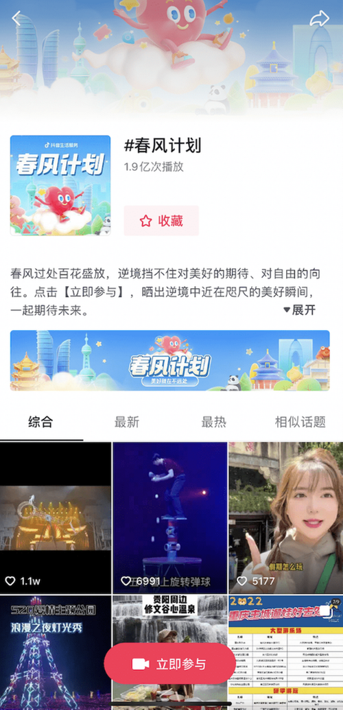 4月初,抖音生活服務(wù)華西直營中心從商家實(shí)際需求出發(fā),聯(lián)合樂山市、綿陽市餐飲行業(yè)協(xié)會、重慶市民宿產(chǎn)業(yè)協(xié)會等部門,攜手啟動了復(fù)蘇專項(xiàng)“春風(fēng)計(jì)劃”。截至5月中旬,項(xiàng)目已開展一月有余,覆蓋四川、重慶、云南三地商家1600余個(gè),通過內(nèi)容種草助力商家提升門店獲客能力。項(xiàng)目總話題#春風(fēng)計(jì)劃,已突破1.9億播放量;聚合熱點(diǎn)內(nèi)容#懷念那個(gè)大口吃肉的成都、#五一重慶游玩攻略等共計(jì)11個(gè)話題,總曝光已突破800萬;數(shù)百個(gè)商家積極投稿短視頻,分享自身優(yōu)惠活動,吸引客流。