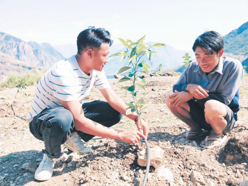 村里二組的地幾乎全是碎石,土少、旱季長(zhǎng)。吉列子日結(jié)合在涼山州雷波縣考察學(xué)會(huì)的滴管灌溉技術(shù),在當(dāng)?shù)匕l(fā)展了50畝3000株臍橙,并為臍橙安裝滴灌膠管6000米,水源主要從山頂12公里外引來。由于村里水源少,吉列子日還組織村民把山上其余5股水也匯入管道增加水源。因?yàn)橛辛说喂嗉夹g(shù),3000株臍橙全部存活,不僅發(fā)展了農(nóng)業(yè),也讓村民們感受到了科技種植的魅力。