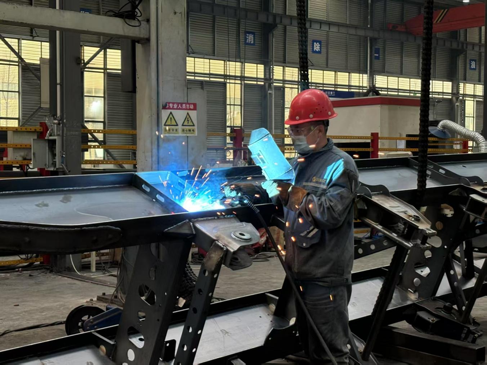 3月6日,在丹棱經(jīng)開(kāi)區(qū)的四川川運(yùn)重工機(jī)械有限公司(以下簡(jiǎn)稱(chēng)“川運(yùn)重工”)掛車(chē)生產(chǎn)車(chē)間內(nèi),一輛骨架式集裝箱運(yùn)輸半掛車(chē)的大梁在工人們的協(xié)作下組裝完成,即將進(jìn)入下一個(gè)車(chē)間噴繪。車(chē)間外,20臺(tái)新能源半掛自卸車(chē)正在進(jìn)行出廠前的測(cè)試,檢查完畢后,即將發(fā)往四川宜賓的一家建筑公司。