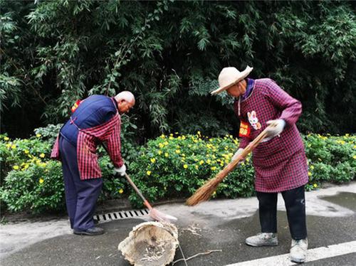 ▲楊俊如(左)和團(tuán)隊(duì)成員正在清掃地面垃圾