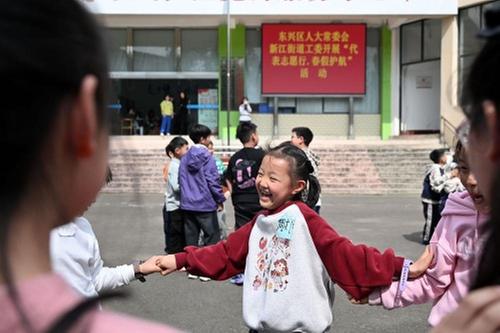 4月2日,在內(nèi)江市東興區(qū)新江街道東風(fēng)社區(qū),小朋友在志愿者的陪伴下快樂玩耍。