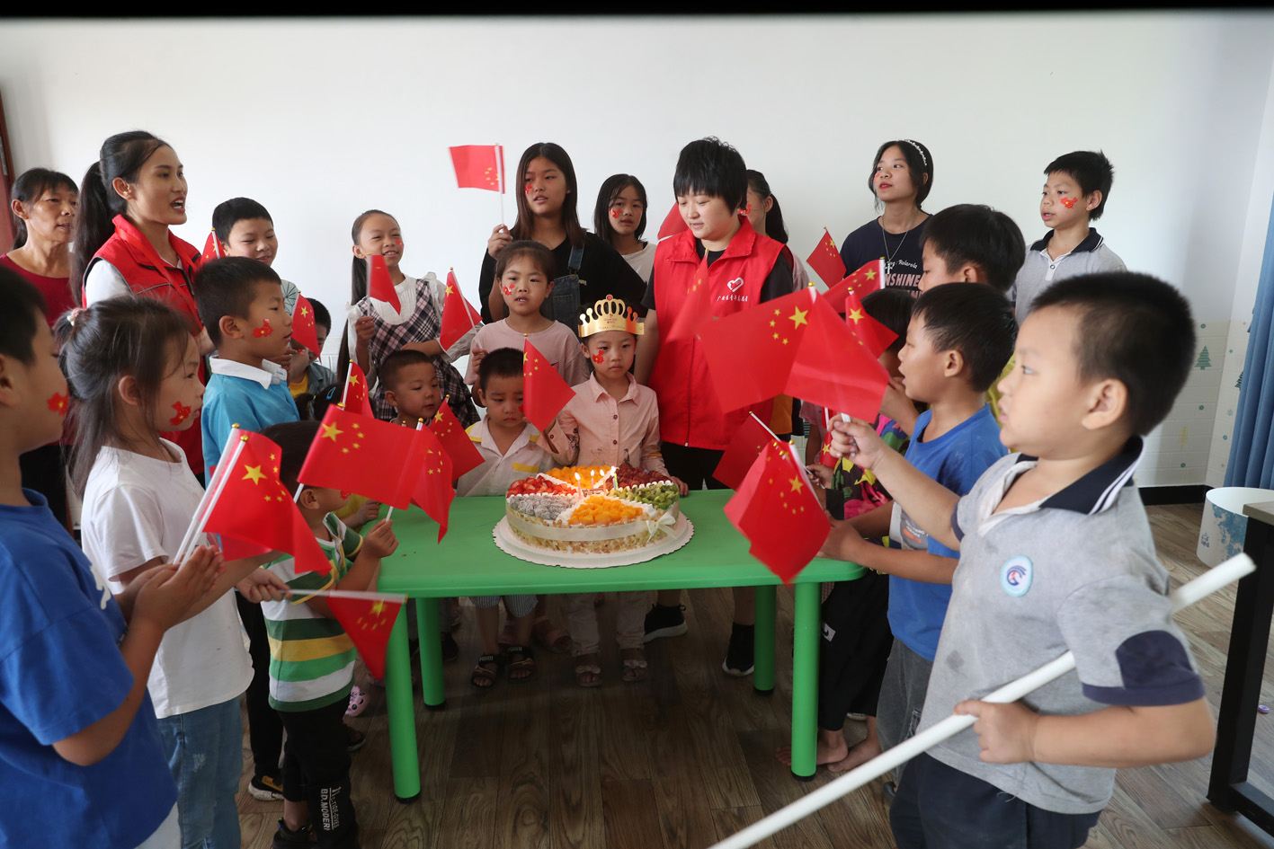 10月1日,在廣安市廣安區(qū)官盛鎮(zhèn)羊角村的假日學(xué)校活動(dòng)室,黨員志愿者正在為留守兒童趙鑫瑞慶祝生日,與其他留守兒童一道手舞小國旗共唱《生日快樂歌》。