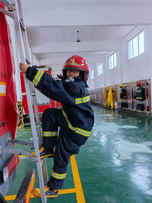 隨后,小朋友們跟隨消防員參觀了消防營區(qū),看到了干凈的樓梯、豆腐塊的被子、整齊的戰(zhàn)斗服,了解消防員日常各種事故救援后,瞬間變成了“消防迷”,有小朋友直呼想當消防員。為了滿足小朋友的心愿,消防員幫助年齡較大的小朋友穿上真正的戰(zhàn)斗服、消防頭盔,小朋友們登上消防車,近距離感受先進的裝備和功能強大的消防車時,都興奮地贊嘆不已;年齡較小的則穿上“消防表演裝”,成為精粹抖擻的“小小消防員”。