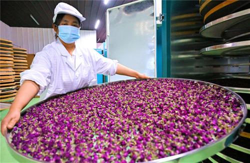 筆者在玫瑰花基地看到,當村民背著一筐筐采摘好的玫瑰花回到基地時,車間工人就會立即開始下一步工作,整理、清洗、烘干,產出玫瑰花茶、玫瑰花餅、玫瑰花露、玫瑰花醬等美食。