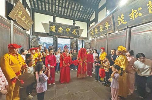 “說起來,婚俗表演與夕佳山民居之間還有一段歷史淵源。”講解員進一步介紹,由于夕佳山民居的前身為黃氏家族所有,且黃家兒女眾多,一共在這里生活過十二代人,這樣的大家族嫁娶就成了當地的熱鬧大喜事,所以只要一提到結婚嫁娶就想到夕佳山黃家舉辦的婚禮,川南婚俗也就深深烙進了當地人心里。