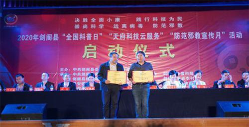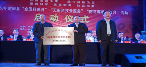 省科協(xié)反邪教協(xié)會(huì)副秘書長(zhǎng)韓岷為四川首批天府科技云服務(wù)科普惠民共享基地——劍閣縣老科協(xié)科普惠民共享基地授牌。