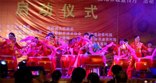 最后,由劍閣縣科普文化藝術(shù)團(tuán)獻(xiàn)上了一臺(tái)高水平的文藝節(jié)目。紅鼓舞《中國(guó)范兒中國(guó)美》拉開(kāi)了序幕,特別是自創(chuàng)并首演的音樂(lè)快板《科技之花云中開(kāi)》和《精準(zhǔn)扶貧政策好》將現(xiàn)場(chǎng)氣氛推向了高潮。