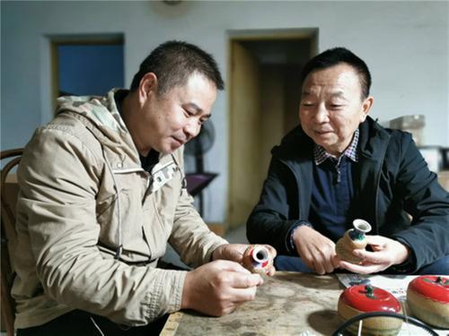 ▲張德明(右)和竹編工藝師商討竹編彩陶作品編織細節(jié)