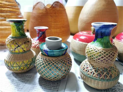 竹編彩陶系列作品是張德明專門為參加本屆竹博會設(shè)計的新產(chǎn)品,涉及花瓶、陶罐、裝飾盒等多種樣式,既精致美觀,又多彩實用。張德明告訴記者,在完善好樣品細節(jié)后,將準備編織1000余個產(chǎn)品用于本屆竹博會的參展。