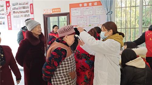 花溪社區(qū)日間照料中心志愿者為參加活動(dòng)老人測(cè)體溫 張燕 攝