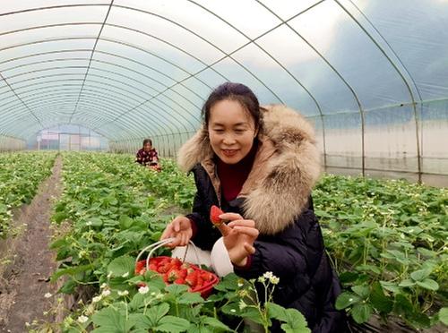 在安富街道三江村草莓基地里,暖意融融,鮮紅飽滿的草莓在綠葉的襯托之下,紅似瑪瑙,個大飽滿、色澤鮮艷,讓人垂涎欲滴。三五成群的游客提著籃子,穿梭在草莓大棚之間,享受愜意采摘生活。