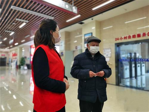 志愿者李文娟正為老人黎成忠(右)做著引導服務。