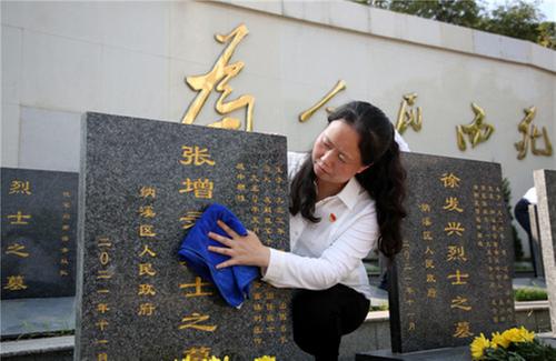 黨員志愿者為烈士擦拭墓碑