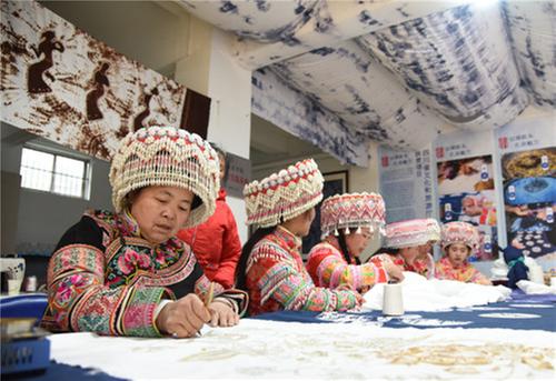 ①瀘州市敘永縣摩尼鎮(zhèn)苗族群眾正全力制作傳統(tǒng)的扎染、苗繡等衣飾制品,以供應(yīng)周邊市場(chǎng)。(李欣 攝)