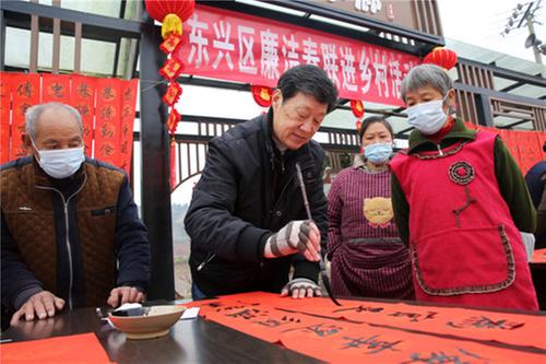 ②內(nèi)江市東興區(qū)紀(jì)委監(jiān)委舉行“廉潔春聯(lián)進(jìn)鄉(xiāng)村”活動(dòng),書法家為黨員干部和村民書寫“廉潔春聯(lián)”。(本報(bào)通訊員 蘭自濤 攝)