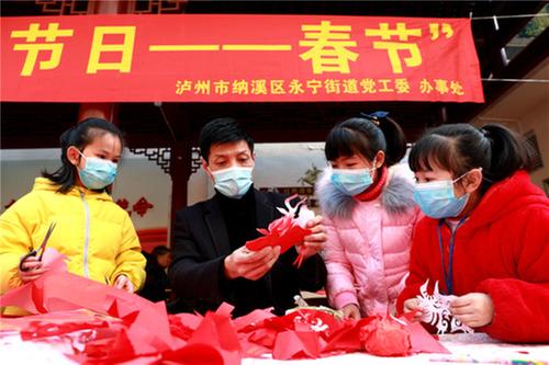 ③瀘州市納溪區(qū)永寧街道開展“剪‘牛’迎春,陪伴童心”活動(dòng),四川省民間藝術(shù)大師、四川省工藝美術(shù)大師王世宏教孩子們剪紙。
