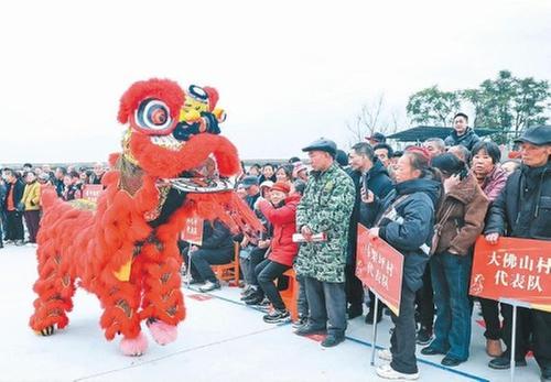 2月9日,廣安華鎣市的民間藝人巡回到永興鎮(zhèn)大佛山村,為當(dāng)?shù)厝罕姾驮谕鈩?wù)工返鄉(xiāng)過(guò)年的鄉(xiāng)親表演舞獅、川劇變臉等節(jié)目,在歡樂(lè)喜慶的氛圍中迎接新春佳節(jié)的到來(lái)。圖為民間藝人正在進(jìn)行舞獅表演。(邱海鷹 攝影報(bào)道)