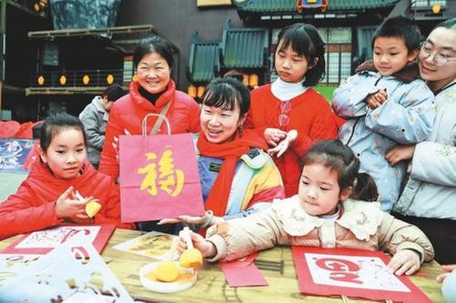 2月7日,瀘州市納溪區(qū)旅游部門(mén)聯(lián)合當(dāng)?shù)貢?shū)法家協(xié)會(huì),在山河明月·醉酒城特色街區(qū)開(kāi)展“迎新春·送祝福”活動(dòng)?,F(xiàn)場(chǎng),書(shū)法家為市民和游客免費(fèi)書(shū)寫(xiě)春聯(lián)、贈(zèng)送“福”字,志愿者積極指導(dǎo)小朋友體驗(yàn)非遺技藝,讓傳統(tǒng)年俗煥發(fā)新活力。圖為志愿者指導(dǎo)小朋友們學(xué)習(xí)拓印技藝。(廖勝春 攝影報(bào)道)