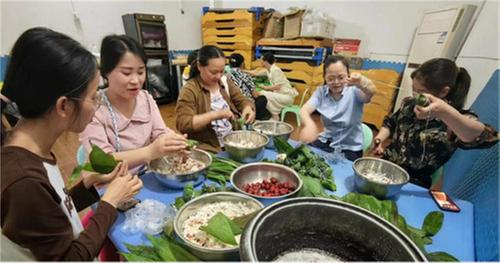 活動伊始,志愿者們拿出提前備好的糯米、餡料、粽葉、棉繩等材料分發(fā)給現(xiàn)場的小朋友們,通過現(xiàn)場示范詳細地為孩子們講解粽葉的選擇、糯米和餡料的處理搭配等知識和技巧。隨后,志愿者們分組而坐,手把手教授小朋友捋粽葉、填糯米、封口、捆扎等步驟,小朋友們沉浸在自己動手的快樂之中,每一顆都凝聚了她們的心血和汗水,每一個人的臉上都洋溢著笑容。