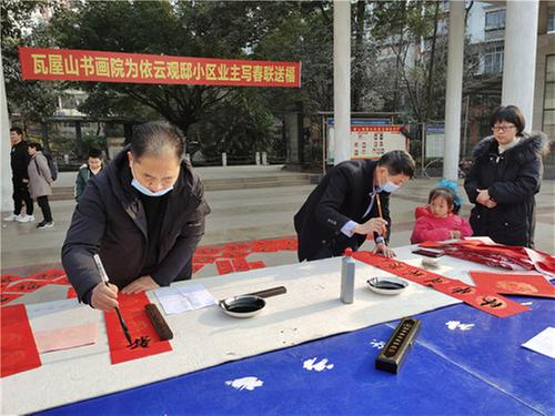 2月6日,“依云觀邸”小區(qū)黨支部特邀瓦屋山書畫院書法家為小區(qū)業(yè)主書寫春聯(lián),送“福”到家。書法家們?cè)诂F(xiàn)場(chǎng)揮毫潑墨,一個(gè)個(gè)碩大的“福”字,一句句暖心的新年祝福,傳遞的是對(duì)未來日子的美好憧憬和對(duì)生活的無限贊美。業(yè)主們接過春聯(lián)和“福”字,互相交流賞析,喜笑顏開。