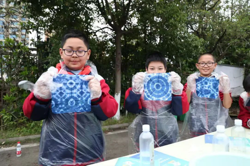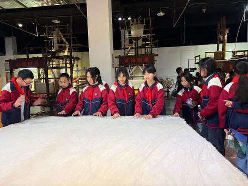 在依格爾紡織品有限公司,同學(xué)們參觀了絲綢經(jīng)緯車間和絲綢博物館,了解絲綢發(fā)展歷史以及抽絲紡織流程。在扎染體驗(yàn)中,學(xué)生通過折疊、捆扎、浸染等步驟制作扎染作品。