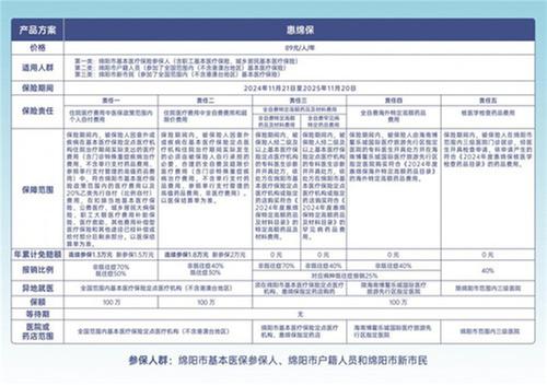 2024年“惠綿保”保費不變,仍是89元/人,保障新升級。即日起,只要是綿陽市基本醫(yī)保參保人(含職工、城鄉(xiāng)居民)、綿陽市戶籍人員和綿陽市新市民均可關(guān)注“惠綿保”微信公眾號在線投保,也可通過9家保險公司線下投保。參保時間為8月22日至10月31日,保障時間為2024年11月21日至2025年11月20日。