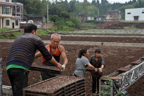 4月9日,內(nèi)江市東興區(qū)石子鎮(zhèn)桂溪社區(qū),“秧保姆”在水稻集中育秧基地勞作。