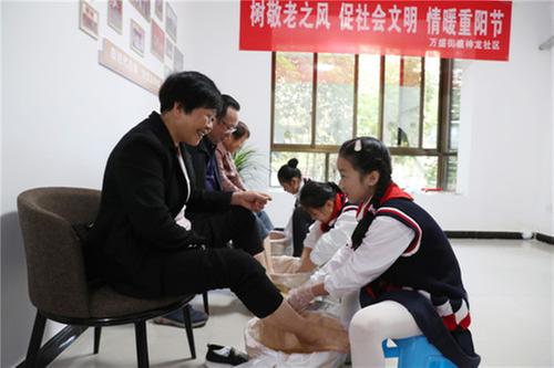 10月22日,在廣安市廣安區(qū)萬盛街道神龍社區(qū)黨群服務(wù)中心,東方小學少先隊員正在給社區(qū)空巢老人洗腳,樹敬老之風,情暖重陽節(jié)。