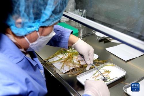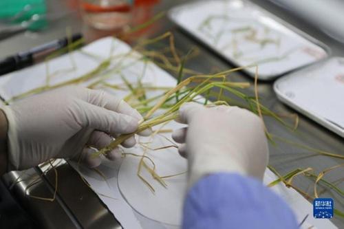 12月5日,在中科院空間應(yīng)用中心生物實(shí)驗(yàn)室,中科院分子植物科學(xué)卓越創(chuàng)新中心鄭慧瓊研究員處理從太空歸來(lái)的水稻樣品。新華社發(fā)