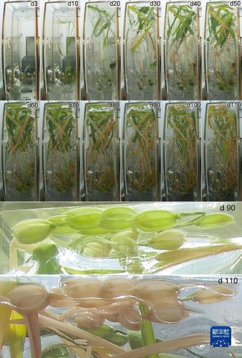 這是水稻在問(wèn)天艙生命生態(tài)實(shí)驗(yàn)柜通用生物培養(yǎng)模塊中完成“從種子到種子”全生命周期不同發(fā)育階段的代表性圖片,圖像上的數(shù)字表示注入營(yíng)養(yǎng)液?jiǎn)?dòng)實(shí)驗(yàn)后的天數(shù)。新華社發(fā)