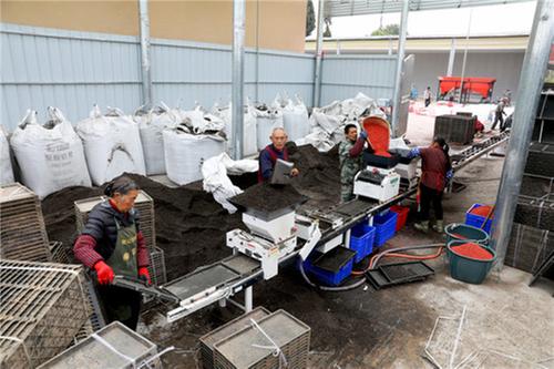 3月11日,在廣安市廣安區(qū)恒升鎮(zhèn)譚龍村低碳綠色育秧中心,村民開展水稻機(jī)械化育秧作業(yè)。