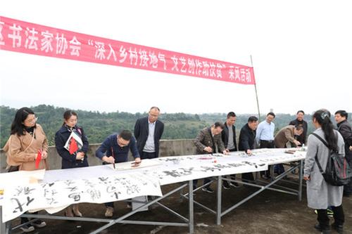 10月8日,在廣安市廣安區(qū)恒升鎮(zhèn)代龍村花椒產(chǎn)業(yè)基地觀景平臺(tái),廣安區(qū)書(shū)法家協(xié)會(huì)書(shū)法家正在為該村現(xiàn)場(chǎng)創(chuàng)作書(shū)法作品,文藝創(chuàng)作助扶貧。