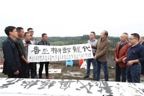 為宣傳近年來(lái)廣安市廣安區(qū)經(jīng)濟(jì)社會(huì)發(fā)展取得的顯著成就,脫貧攻堅(jiān)工作給美麗鄉(xiāng)村帶來(lái)的可喜變化,給廣大群眾帶來(lái)的幸福感和獲得感,進(jìn)一步激發(fā)全區(qū)上下齊心協(xié)力奔小康的熱情,激發(fā)書(shū)協(xié)全體會(huì)員積極創(chuàng)作出緊貼時(shí)代、緊跟步伐的書(shū)法佳作,10月8日國(guó)慶節(jié)最后一天,在廣安區(qū)紀(jì)委干部、廣安區(qū)書(shū)法家協(xié)會(huì)副主席、恒升鎮(zhèn)代龍村駐村第一書(shū)記劉盛平的牽線搭橋下,廣安區(qū)書(shū)法家協(xié)會(huì)組織20余名書(shū)法家來(lái)到已經(jīng)摘掉窮帽的省定貧困村開(kāi)展“深入鄉(xiāng)村接地氣,文藝創(chuàng)作助扶貧”采風(fēng)活動(dòng)。