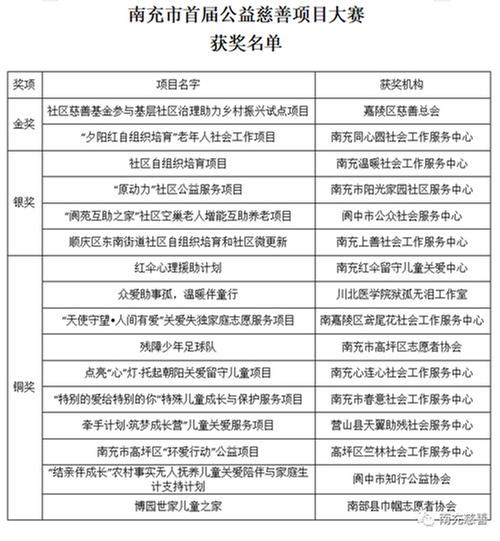 通過(guò)激烈角逐,全市22家慈善公益組織和社工機(jī)構(gòu)的24個(gè)優(yōu)秀項(xiàng)目完成路演比賽,最終,經(jīng)過(guò)專家評(píng)定,嘉陵區(qū)慈善總會(huì)的“社區(qū)慈善基金參與基層社區(qū)治理,助力鄉(xiāng)村振興試點(diǎn)項(xiàng)目”和南充同心圓社會(huì)工作服務(wù)中心的“‘夕陽(yáng)紅自組織培育’老年人社會(huì)工作項(xiàng)目”榮獲金獎(jiǎng),南充溫暖社會(huì)工作服務(wù)中心的“社區(qū)自組織培育項(xiàng)目”等4個(gè)項(xiàng)目獲得銀獎(jiǎng),南充紅傘留守兒童關(guān)愛中心的“紅傘心理援助計(jì)劃”等10個(gè)項(xiàng)目獲得銅獎(jiǎng)。