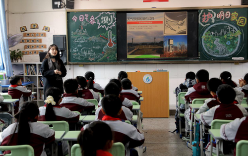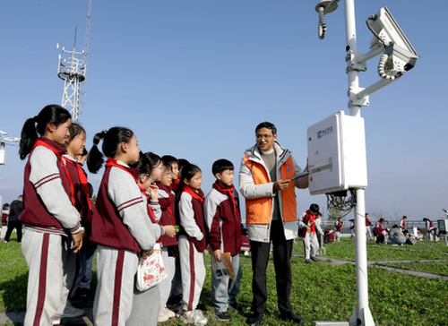 (圖為:氣象科普特派員向富源小學(xué)學(xué)生介紹氣象監(jiān)測(cè)儀器的功能和作用。)