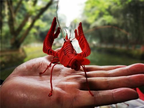 “仿真竹編同平面竹編、瓷胎竹編很不一樣,要在‘真’字上下功夫,還有就是要注重比例搭配,要不然就會很難看。比如,我要事先多觀察蝦腿、蝦眼、蝦須,看看它是如何生長的,然后盡自己最大努力將它呈現(xiàn)出來。”陳云華左手拿著仿真龍蝦,右手捏著活龍蝦形象地介紹道。一絲一蔑需用心,一折一扣皆用情。為了讓蝦須逼真且富有動感,陳云華巧妙地將細(xì)銅絲與竹編融為一體,返璞歸真,靈動自然。