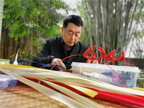 初冬的中國竹藝城透著微微涼意,幽幽竹林間,竹編大師陳云華正忙著編織仿真竹編龍蝦樣品。竹篾、銅絲、手鉗、粘膠等工具擺滿桌面,兩支紅色仿真竹編龍蝦樣品立體喜慶、生動逼真。
