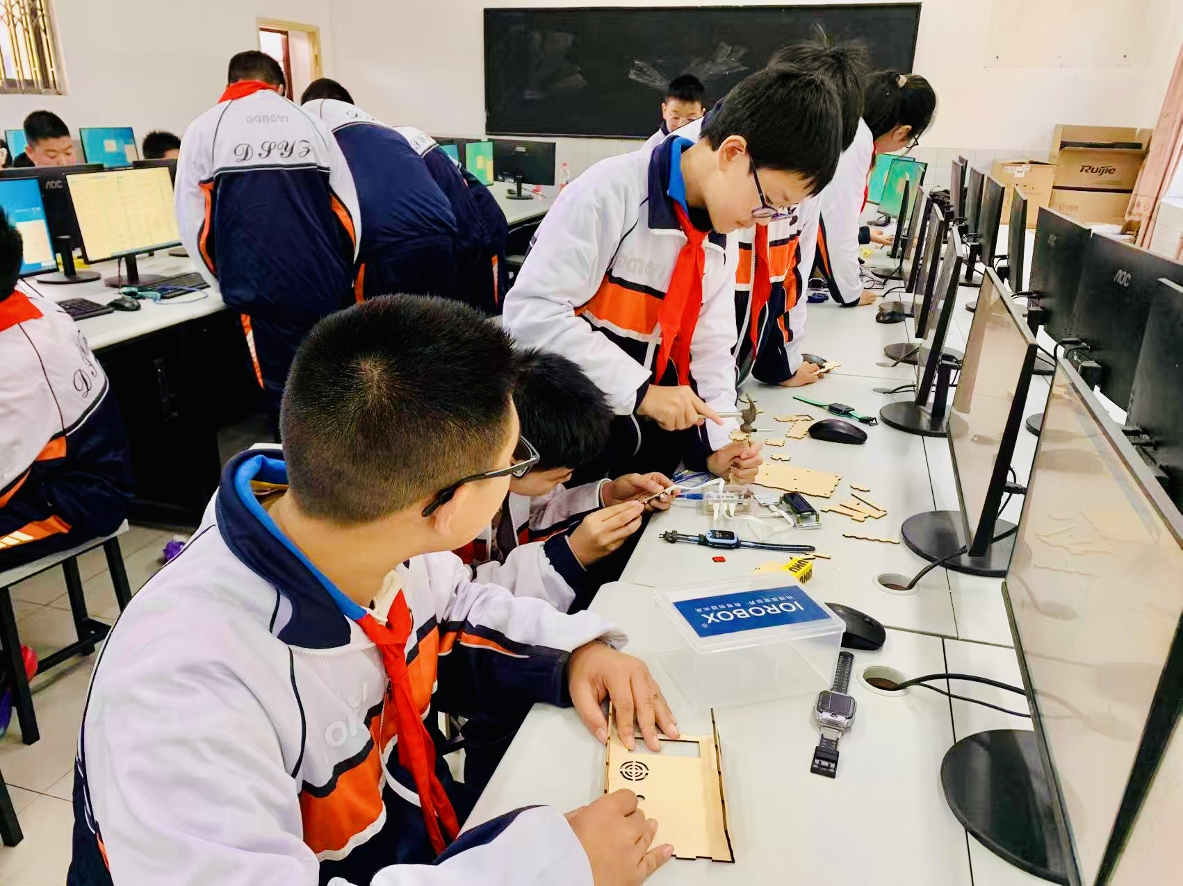 在“智能電話”制作實踐環(huán)節(jié),學生們在科技輔導員的帶領下,分組開展硬件組裝、程序編寫與功能調試等實操任務。通過完整的項目體驗,同學們不僅加深了對科技理論的理解,更鍛煉了動手能力、團隊協(xié)作能力和實際問題解決能力。現(xiàn)場互動頻繁,氣氛活躍。