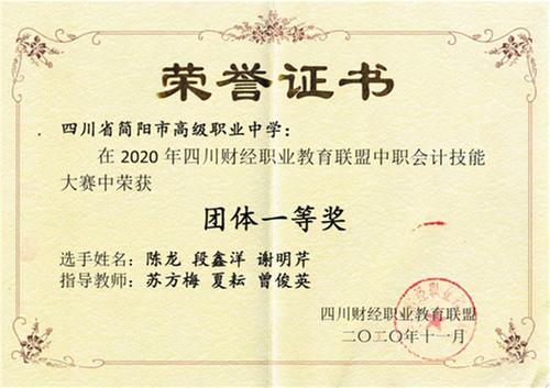 技能成就夢(mèng)想 ,夢(mèng)想從這里起航。11月14日,由四川財(cái)經(jīng)職業(yè)教育聯(lián)盟主辦,四川財(cái)經(jīng)職業(yè)學(xué)校承辦的“2020年四川財(cái)經(jīng)職業(yè)教育聯(lián)盟中職會(huì)計(jì)技能大賽”順利進(jìn)行。經(jīng)過(guò)六小時(shí)緊張而激烈的角逐,四川省簡(jiǎn)陽(yáng)市高級(jí)職業(yè)中學(xué)代表隊(duì)(參賽選手:陳龍、段鑫洋、謝明芹;指導(dǎo)教師:夏耘、蘇方梅、曾俊英)以總分第一的成績(jī)榮獲團(tuán)體一等獎(jiǎng)。