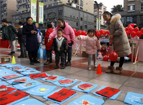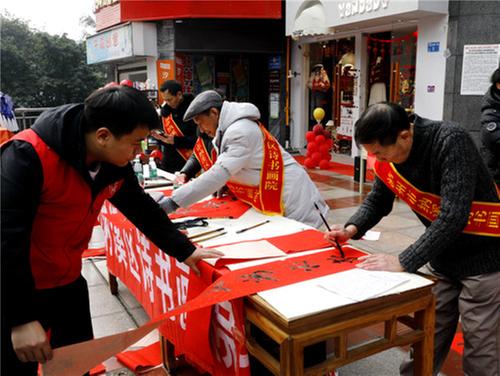 志愿者為群眾免費(fèi)書寫春聯(lián)。王超明 攝
