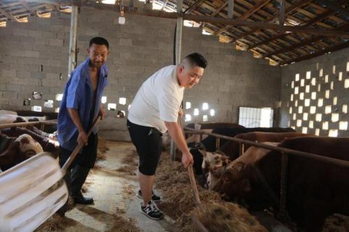 王坤(右)給牛投喂草料。