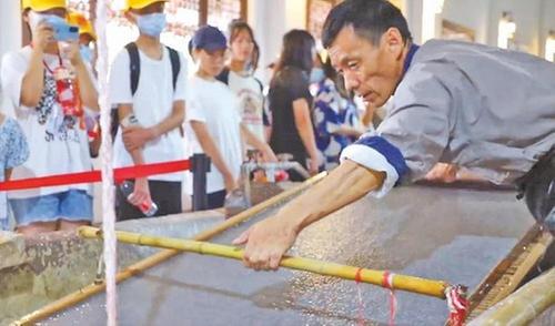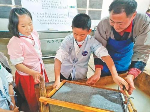 青少年學(xué)習(xí)、體驗抄撈紙張。