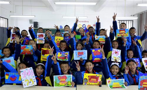 稻城縣金珠鎮(zhèn)牧區(qū)重點(diǎn)寄宿制學(xué)校的學(xué)生展示創(chuàng)作的“祝福祖國(guó) ”繪畫(huà)作品。王超明 攝
