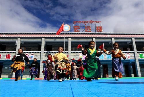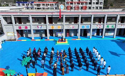瀘州幫扶稻城縣工作隊(duì)隊(duì)員與當(dāng)?shù)夭刈迦罕姾褪∧膏l(xiāng)幼兒園小朋友們一起升國(guó)旗,喜迎國(guó)慶佳節(jié)。王超明 攝