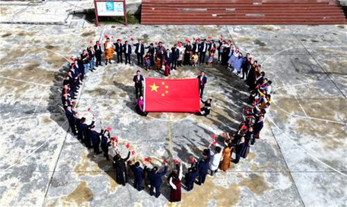 瀘州幫扶稻城縣工作隊(duì)隊(duì)員與當(dāng)?shù)夭刈迦罕姾褪∧膏l(xiāng)幼兒園小朋友們一起,在操場(chǎng)上擺出心型字樣,喜迎國(guó)慶75周年到來(lái)。王超明 攝
