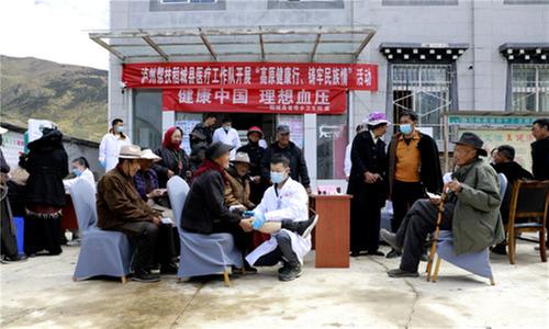 瀘州幫扶稻城縣醫(yī)療工作隊(duì)隊(duì)員為稻城縣省母鄉(xiāng)干部群眾義診,并免費(fèi)發(fā)放藥品。王超明 攝