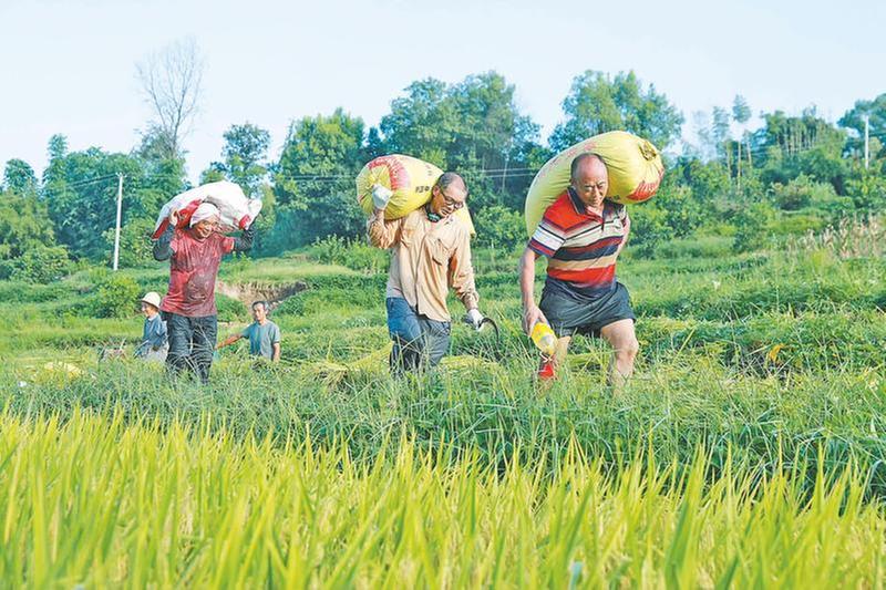 8月13日,在瀘州市納溪區(qū)豐樂鎮(zhèn)皂角村,村民在搬運收割的稻谷。立秋過后,該區(qū)的28.9萬畝水稻進入收割期,當(dāng)?shù)剞r(nóng)民采用“機械+人工”相結(jié)合的方式收割稻谷,確保顆粒歸倉。(廖勝春 韓知耘 攝影報道)