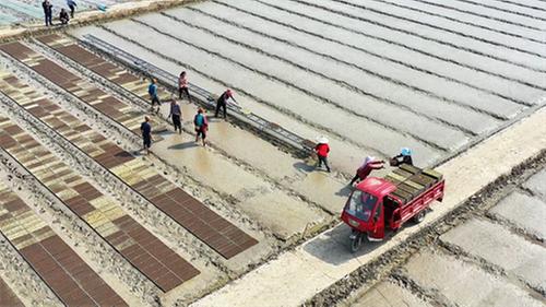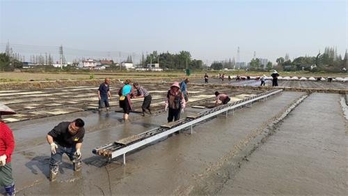 3月27日,在東坡區(qū)崇禮鎮(zhèn)萬(wàn)畝綠色蔬菜基地,一百多位村民頭戴草帽、膠靴裹滿泥漿,一步一印地踏入泛著水光的秧田,在種糧戶巫志祥的組織下開(kāi)始水稻育秧擺盤(pán)工作。