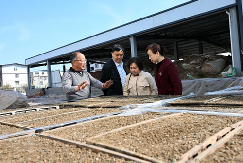 農(nóng)業(yè)專家團隊成員在東興區(qū)宏展糧油專合社查看機械化育秧情況。