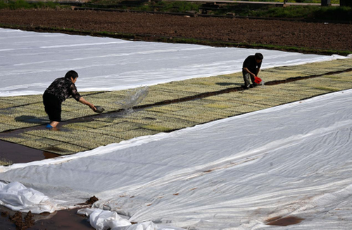 農(nóng)業(yè)工人在專家的指導下進行集中育秧作業(yè)。